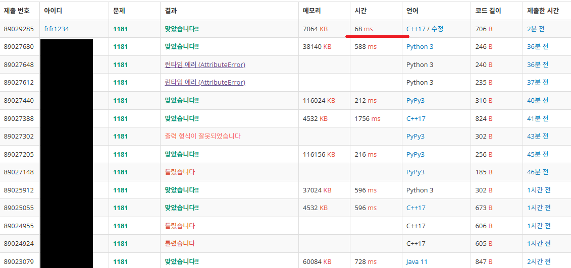 문자열 중복 확인은 set으로, 정렬은 priority_queue로 해결했다. 다른 문제는 대부분 세자릿수 ms를 기록한 것과 비교해 68ms의 매우 빠른 속도로 문제를 푼 것을 확인할 수 있다.