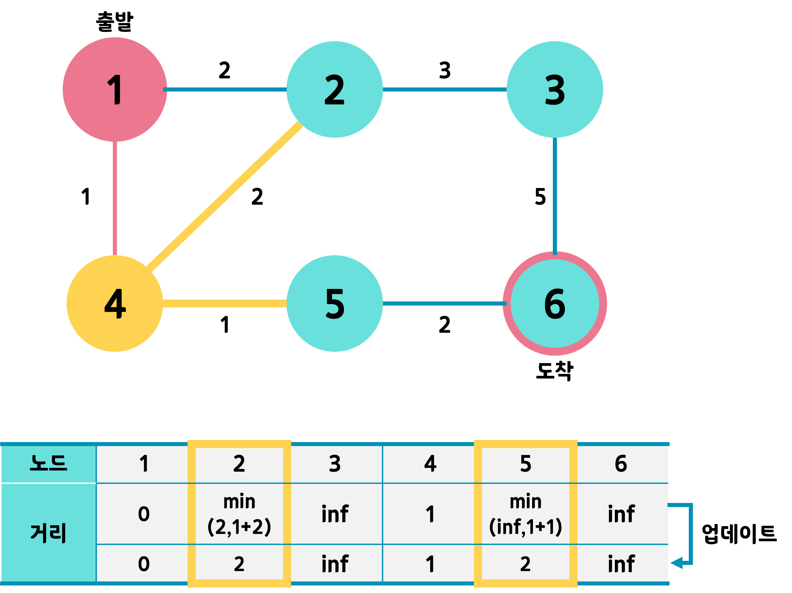 - 우선순위 큐에서 다음 노드인 4번 선택 후, 인접한 노드와 거리 갱신