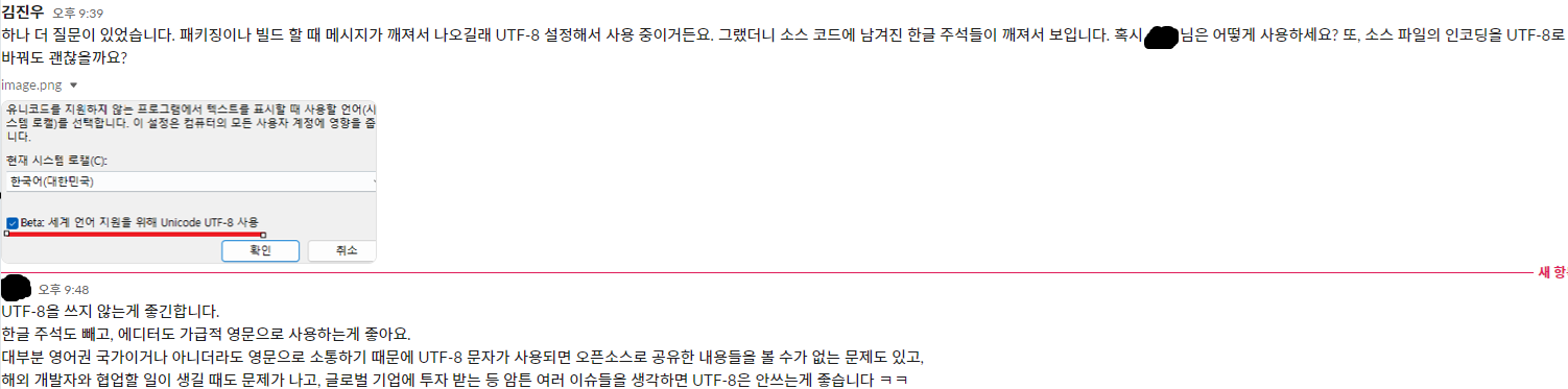 인터넷에 빌드 메시지 깨져서 나올 때 UTF-8 설정하라는 글들이 많다. 나도 원래는 UTF-8을 설정해서 문제를 해결했는데, 실제 외국 기업과 많은 협업을 하고 있는 현업 개발자 피셜 UTF-8은 사용하지 않는게 좋다는 의견이 있다.