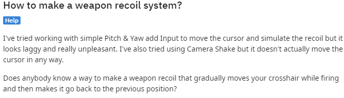 아래는 관련 자료를 찾던 중 발견한 글이다. 나와 같이 무기 반동 시스템을 구현하기 위해 질문한 사람이 레딧에 쓴 것이다.